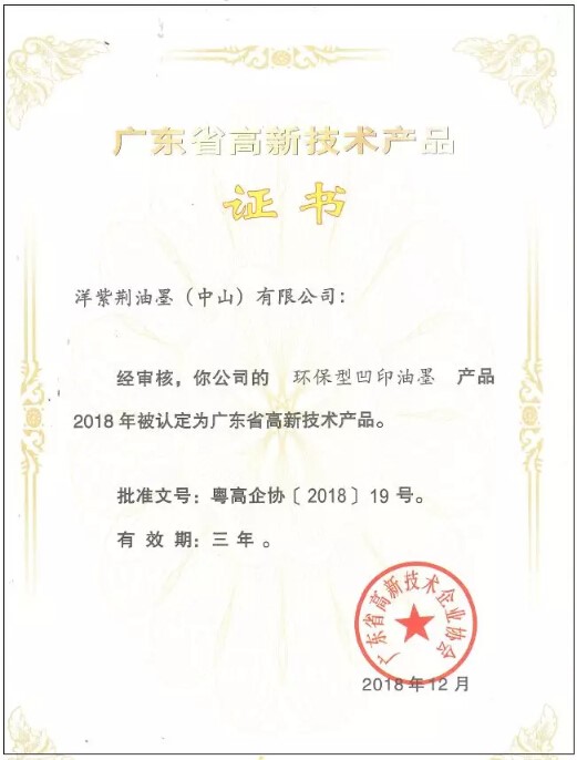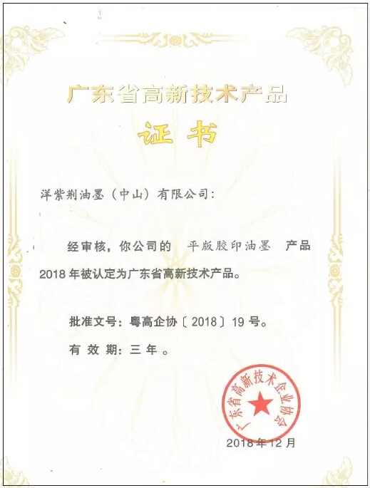据悉,根据《关于组织申报广东省2018年高新技术产品认定的通知》(粤高企协〔2018〕7号)的要求,经企业申报、专家评审、公示、认定等多项环节,广东省高新技术企业协会专家组对企业申报的产品进行了严格评审,洋紫荆油墨的产品已到达入评高新技术产品的标准,获得评审组的一致肯定,成功入选“广东省高新技术产品”。