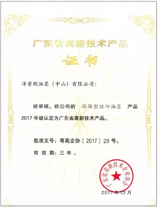 继2017年认定洋紫荆的“环保型丝印油墨”为“广东省高新技术产品”,目前,我司有三大广东省高新技术产品。
